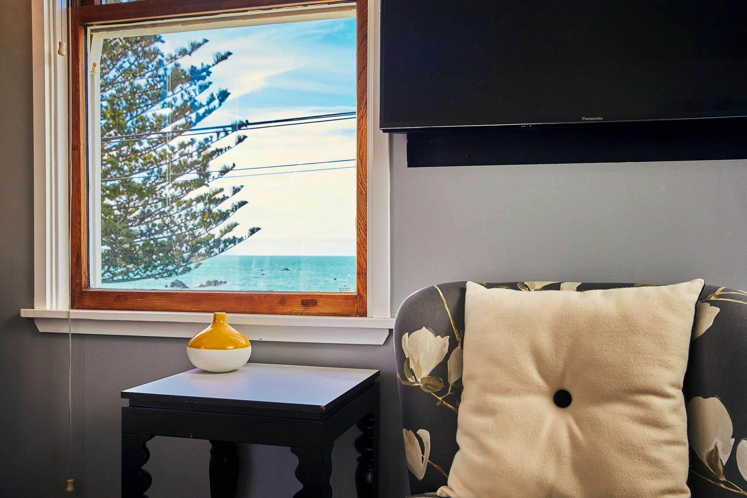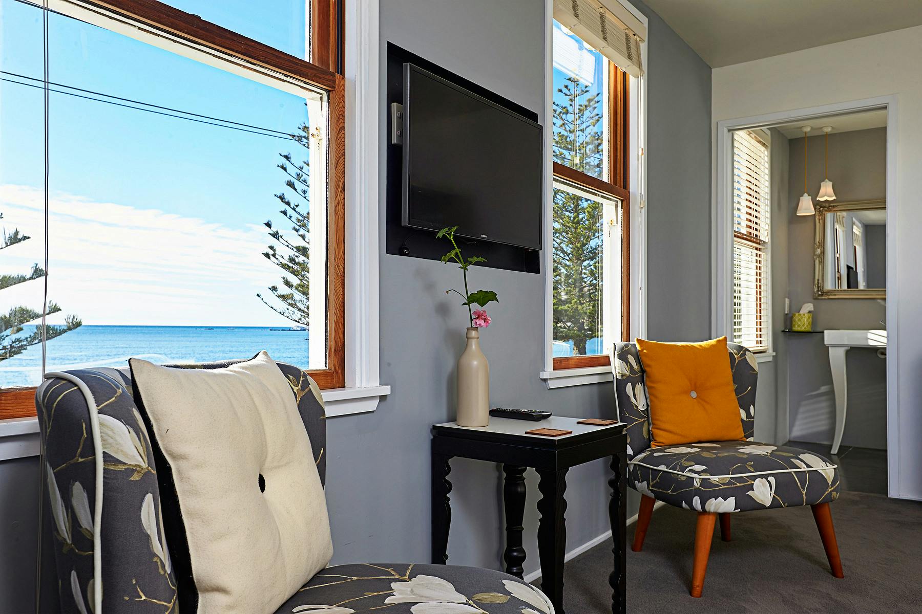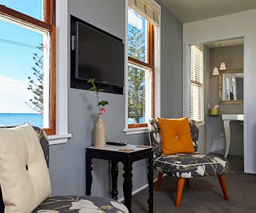 Elegant spacious luxe room with front-on sea views and large balcony. Comfortable king bed, large, tiled bathrooms with rainwater showers, climate-controlled air, luxury bathroom products, smart tv and Wi-Fi.